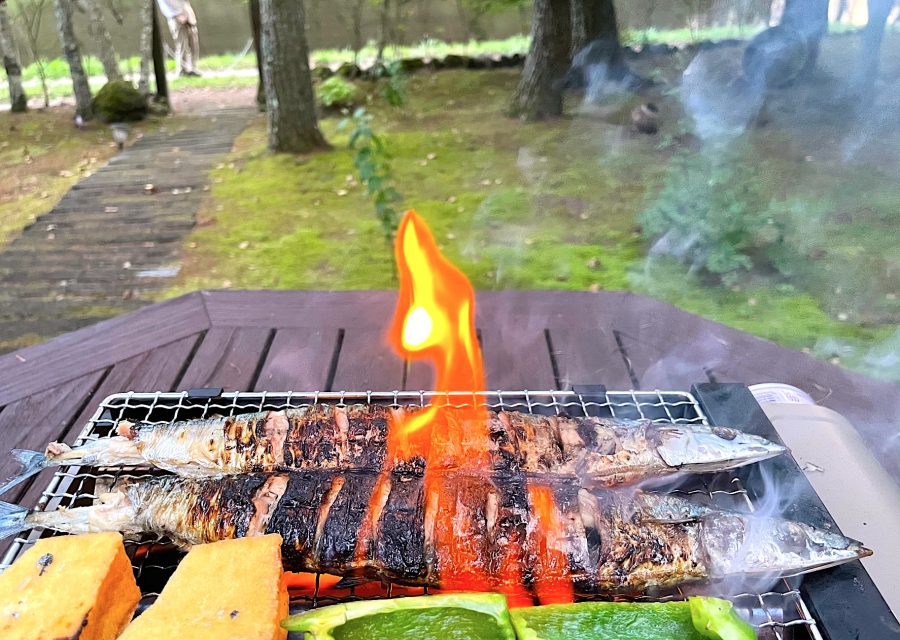大豊作だったという秋刀魚を焼く。勢いのいい炎に気持ちもあがる