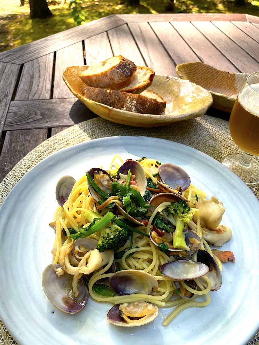 秋のテラスご飯。今年はキノコたっぷりのアサリパスタが美味しかった