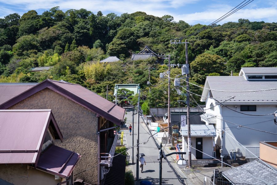 近くにはサーフィンのスポットとしても知られる由比ヶ浜海岸が広がる