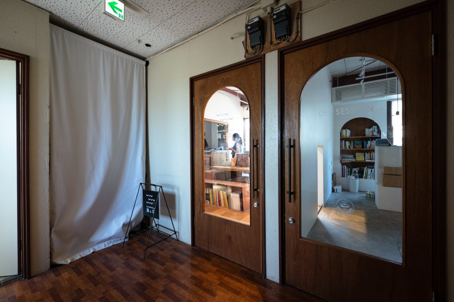 左が『海と本』、右が『OFF SESSiON』。お店を仕切る壁には、お客さんが自由に往来できるに小さな出入り口を設置