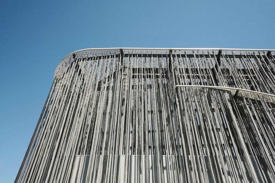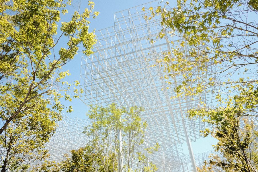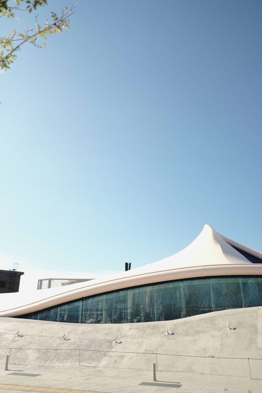 薄い膜を重ねたような繊細な外装で、空の光がそのまま建築の表情になる。
