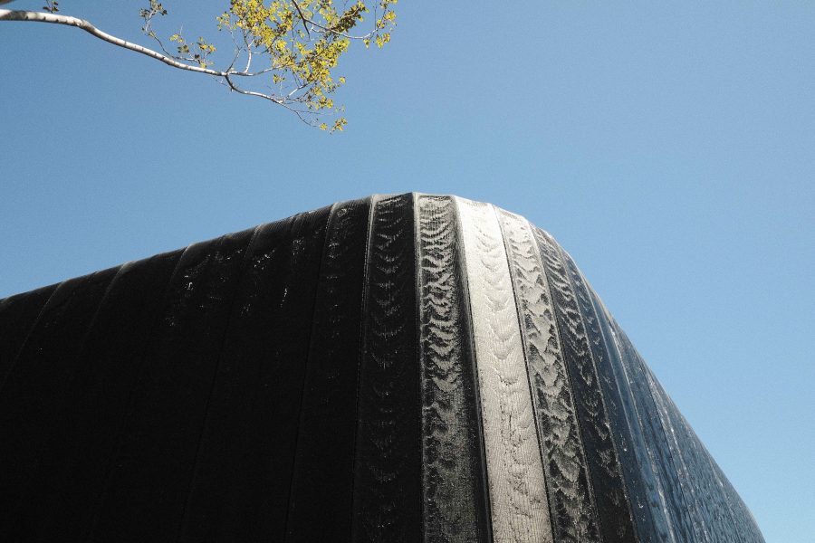 上から水が流れ落ちるファサード。
