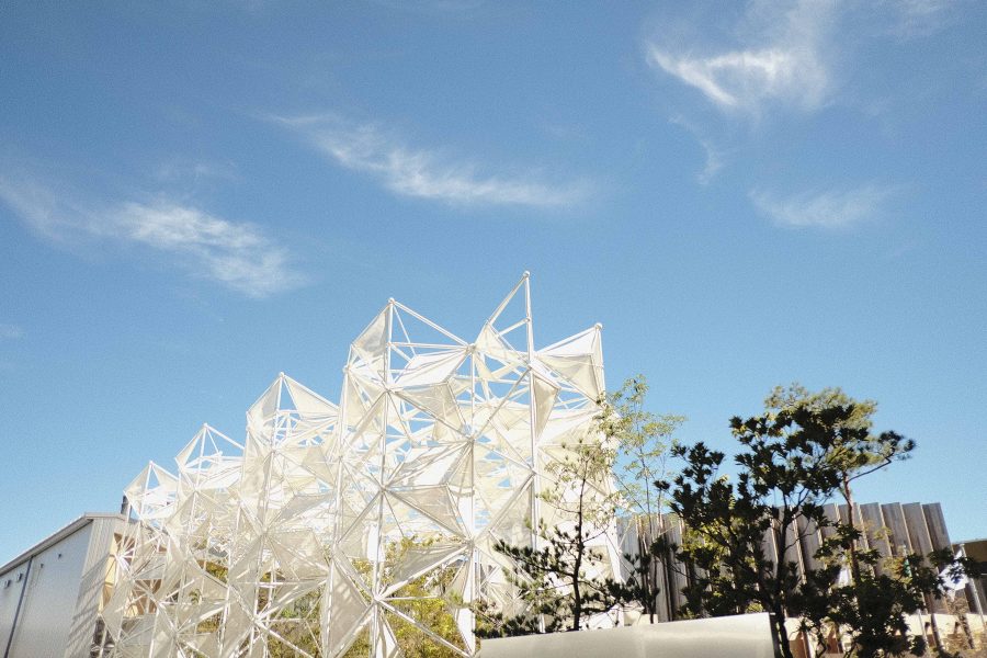 まちなかの建築と違って、万博のパビリオンには繰り返しや多角形といった明確な造形ルールが多く見られる。それらは、空をまるでキャンバスのように扱い、建築の輪郭をそこに描き出しているようにも思えた。