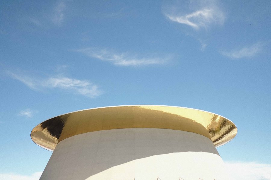 金色の皿で、空をすくい上げるような建築。