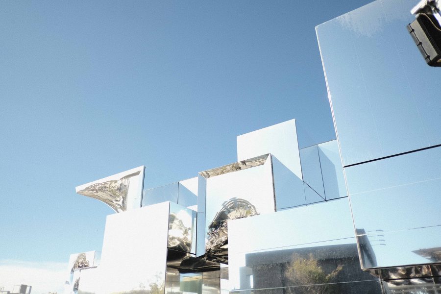 鏡面の空気膜。音の振動に反応し、空の風景がつねに揺れ動く。