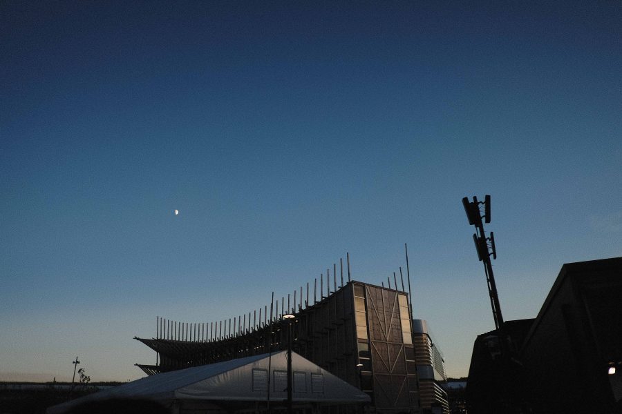 薄暗くなる空に対して、浮かび上がる大屋根リングの照明。